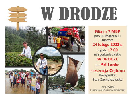 Zapraszamy 24 lutego 2022 r. (czwartek) na godz. 17.00 do Filii nr 7 MBP przy ul. Podgórnej 1. Tym razem w ramach cyklu "W drodze" zapraszamy na spotkanie z Ewą Zacharzewską, która zabierze nas w podróż po Sri Lance - esencji Cejlonu.