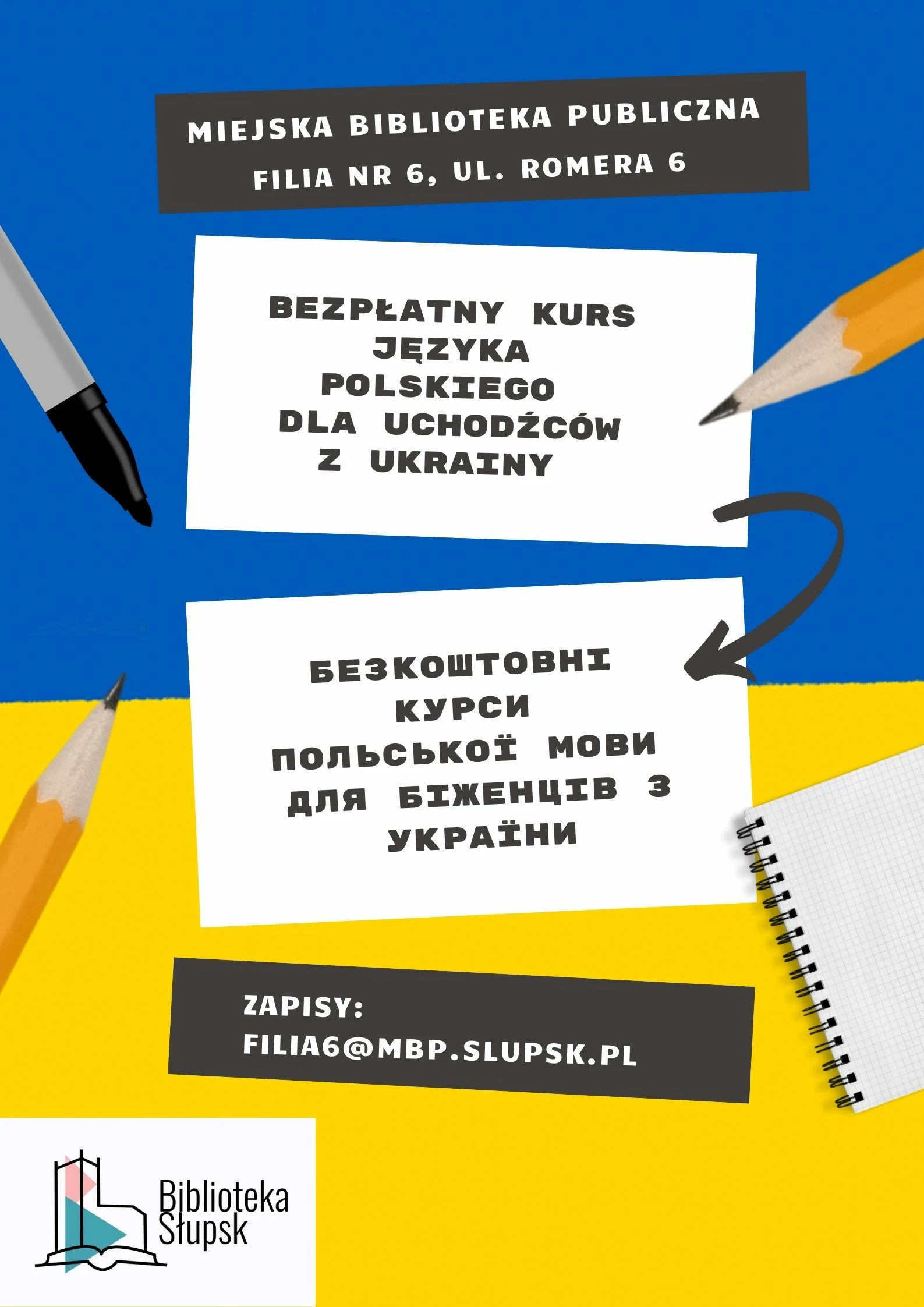 Wychodząc naprzeciw obecnej sytuacji nasza biblioteka pragnie wesprzeć osoby z Ukrainy, które były zmuszone opuścić swój kraj. Postanowiliśmy zorganizować BEZPŁATNY kurs języka polskiego dla dorosłych.