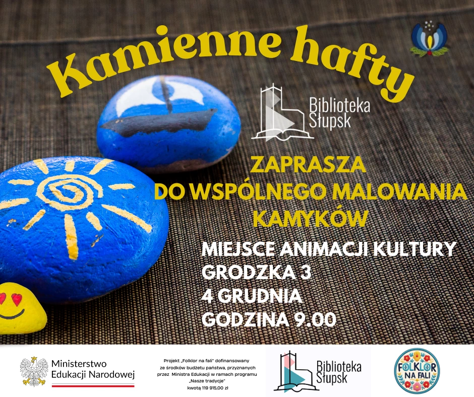 Zapraszamy na kreatywne warsztaty „Kamienne Hafty”. Dzieci i dorośli będą wspólnie malować kamyki inspirowane tradycyjnymi wzorami haftów kaszubskich, kociewskich i słowińskich. Uczestnicy otrzymają kamyki oraz materiały plastyczne i stworzą własne wersje ludowych motywów. Gotowe prace zostaną pokazane na wystawie w bibliotece.