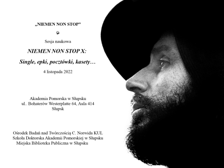 Serdecznie zapraszamy na 10. edycję sesji naukowej "Niemen Non Stop" pt. "Single, epki, pocztówki, kasety", która odbędzie się w piątek 4 listopada o godz. 9.15, w Auli 414 Akademii Pomorskiej przy ul. Bohaterów Westerplatte 64 w Słupsku. Gospodarzem jest Akademia Pomorska w Słupsku, wsparcia udziela Szkoła Doktorska Akademii Pomorskiej, Ośrodek Badań nad Twórczością C. Norwida KUL oraz Miejska Biblioteka Publiczna w Słupsku (Klub Czarnego Krążka).