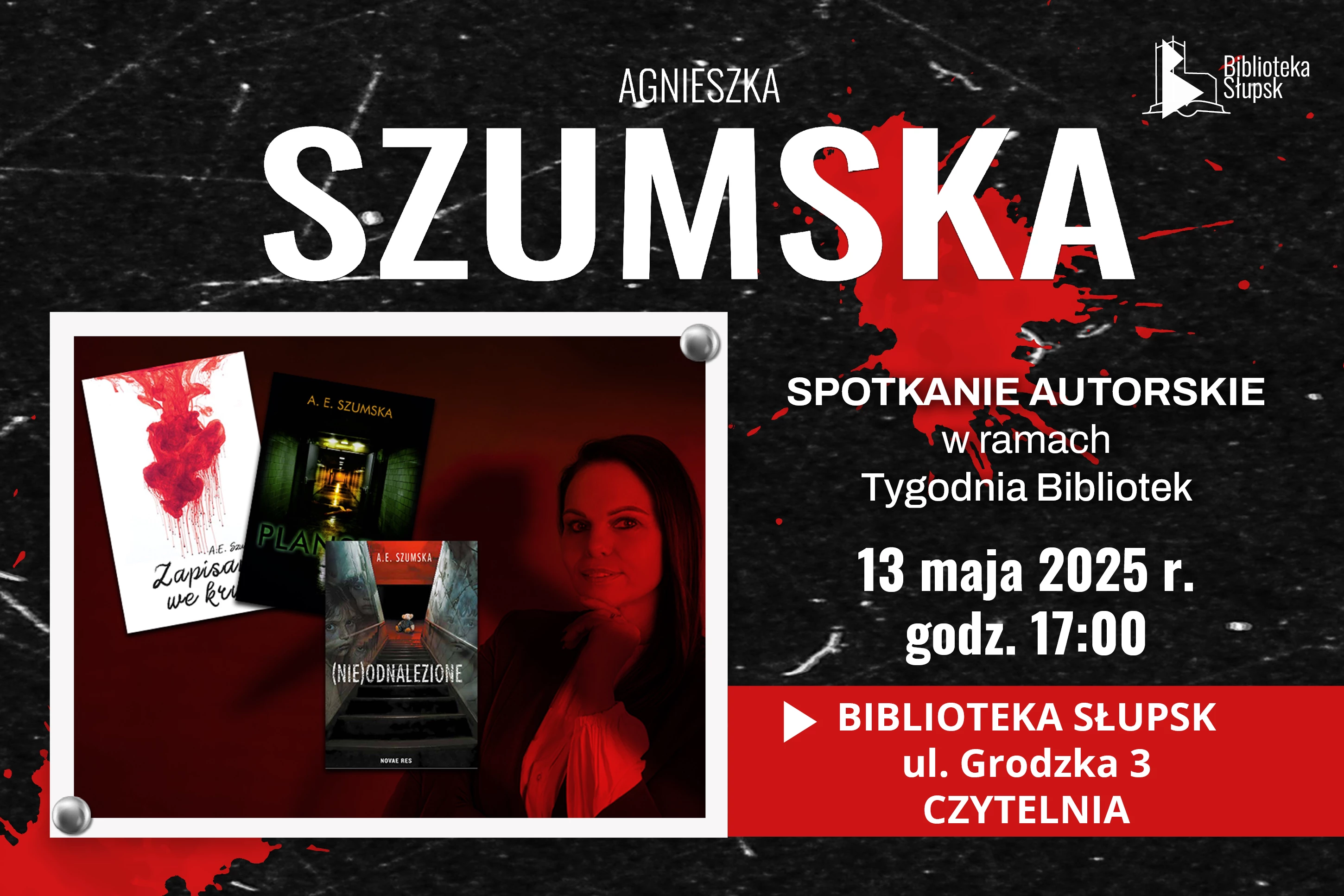 W dniu 13 maja 2025r. o godz. 17:00, w ramach Tygodnia Bibliotek, zapraszamy na rozmowę ze słupską pisarką, Agnieszką Szumską.